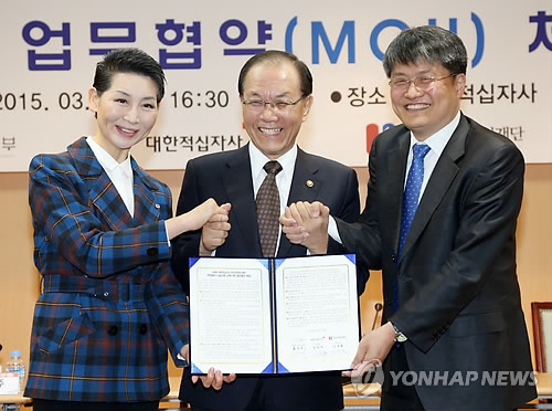 △ 교육기부 업무협약 체결식 (서울=연합뉴스) 김성주 대한적십자사 총재(왼쪽부터)와 황우여 사회부총리 겸 교육부 장관, 김승환 한국과학창의재단 이사장이 19일 오후 서울 중구 대한적십자사 본사에서 열린 창의인재 및 인도주의 글로벌 리더 양성을 위한 나눔교육 교육기부 업무협약(MOU) 체결식에서 협약서에 서명 후 기념촬영을 하고 있다. (교육부 제공)