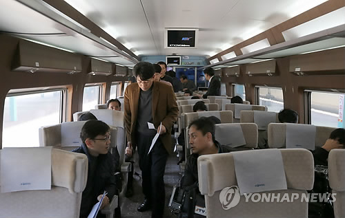 △ KTX 살펴보는 취재진 (익산=연합뉴스) 김동철 기자 = 19일 오후 전북 익산역에서 충북 오송까지 오가는 호남고속철도 시승행사가 열린 가운데 취재진이 KTX 산천에 탑승해 내부를 살펴보고 있다. 2015.3.19 sollenso@yna.co.kr