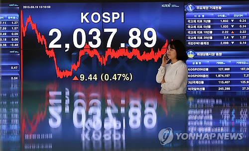 이날 코스피지수는 전날보다 9.44포인트(0.47%) 오른 2,037.89로 마감해 올해 들어 최고 수준을 기록했다.