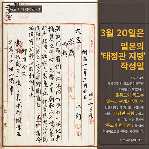 한국 홍보 전문가인 서경덕 성신여대 교수는 20일 국민이면 누구나 알아야 할 '독도 지식 캠페인 3탄'으로 태정관지령을 소개했다.