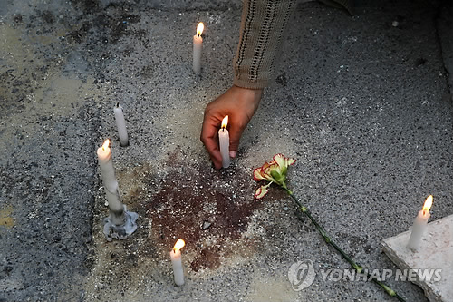 | △ 생생한 핏자국에선 아직도 비명이 들리는 듯 (AP=연합뉴스) 외국인 관광객 20명의 목숨을 앗아간 튀니지 수도 튀니스의 바르도 국립박물관 테러 현장에 남아있는 핏자국 위에 19일(현지시간) 한 남자가 촛불을 밝히며 희생자들을 추모하고 있다. marshal@yna.co.kr |