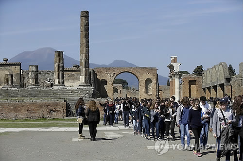 | △ (AP=연합뉴스) 20일(현지시간) 2년 보수 끝에 재개장한 폼페이의 '신비의 저택' 근처에 관광객들이 모여 있다. |