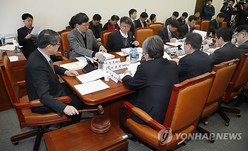 | △ 공무원연금특위 대타협기구 재정추계분과회의 (서울=연합뉴스) 이상학 기자 = 23일 오전 국회에서 열린 공무원연금특위 대타협기구 재정추계분과회의에서 김용하 위원장이 의사봉을 두드리고 있다. |