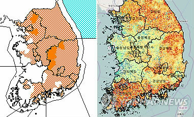 | △ 붉게 물든 '산불위험지수 지도' (대전=연합뉴스) 정윤덕 기자 = 전국 대부분 지역에 건조특보(왼쪽)가 내려진 가운데 산림청이 운영하는 국가산불위험예보시스템상 산불위험지수 지도(오른쪽)도 23일 오후 4시 30분 현재 온통 붉게 물들어 있다. 2015. 3. 23. cobra@yna.co.kr |