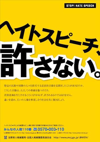 법무성은 '헤이트스피치 불허'란 제목의 포스터를 1만6천 장 제작해 지난 2월 중앙 관공서 및 산하기관, 지방자치단체, 공공기관 등에 배포했다. 시각 효과가 높은 노란색 바탕에 검은색 글씨로 헤이트스피치의 뜻과 불허 방침 이유를 설명해놓았다.