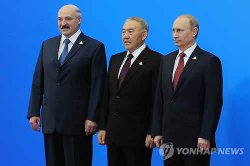 | △ 블라디미르 푸틴 러시아 대통령(오른쪽)과 누르술탄 나자르바예프 카자흐스탄 대통령(가운데), 알렉산드르 루카셴코 벨라루스 대통령이 2014년 5월 29일 카자흐 수도 아스타나에서 옛 소련권 경제공동체 '유라시아경제연합'(EEU) 창설 조약에 서명한 후 포즈를 취하고 있다. (연합뉴스 DB) |