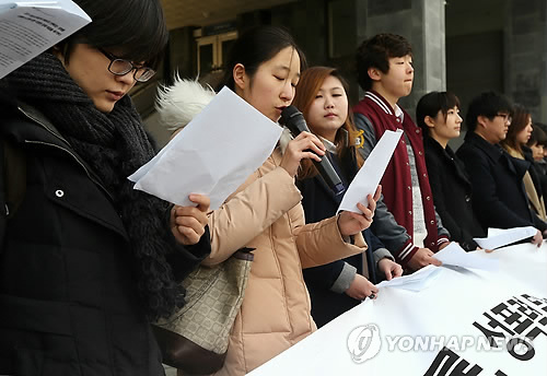 | △ 공동대응 출범 기자회견하는 서울대생들 (서울=연합뉴스) 이지은 기자 = 서울대학교 학부와 대학원 학생들이 11일 오전 서울 관악캠퍼스 행정관 앞에서 교수들의 잇따른 여학생 성추행 문제에 대응하기 위해 '서울대 교수 성희롱, 성폭력 문제해결을 위한 공동행동'을 출범하며 기자회견을 열고 있다. 2015.2.11 jieunlee@yna.co.kr |