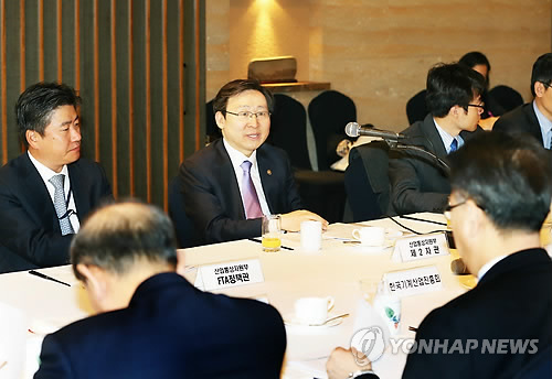 | △ 문재도 차관, 업종단체 FTA 조찬 간담회 주재 (서울=연합뉴스) 문재도 산업통상자원부 2차관이 25일 서울 서초구 팔래스호텔에서 '업종단체(기업) FTA 조찬 간담회'를 주재하고 있다. 2015.3.25 << 산업통상자원부 제공 >> photo@yna.co.kr |