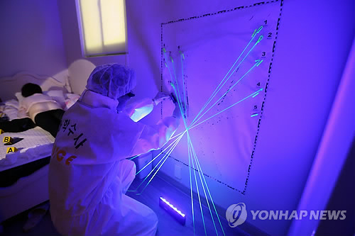 △ 혈흔 감식하는 CSI 요원 (전주=연합뉴스) 김진방 기자 = 25일 전북지방경찰청에 문을 연 'CSI 실습장'에서 과학수사대 요원이 혈흔 감식을 하고 있다. CSI 실습장은 전북경찰청에 전국 최초로 설치됐으며, 이 곳에서는 CSI 요원 교육과 청소년들의 체험학습 등이 진행될 예정이다. 2015.3.25 chinakim@yna.co.kr