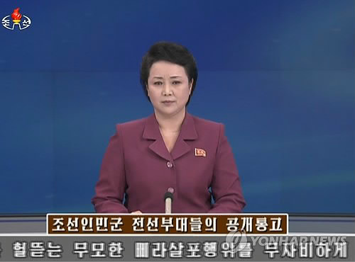 | △ 북한 "대북전단에 화력타격…주민대피 하라" (서울=연합뉴스) 북한은 22일 탈북자단체가 천안함 사건 5주기를 전후로 예고한 대북전단 살포에 대해 무력으로 대응하겠다는 뜻을 밝혔다. 북한은 이날 발표한 '조선인민군 전선부대들의 공개통고'에서 탈북자단체의 대북전단 살포 계획을 비난하며 "모든 타격수단들은 사전경고 없이 무차별적인 기구소멸작전에 진입하게 될 것"이라고 밝혔다고 조선중앙TV가 전했다. 이어 "삐라 살포에 대한 물리적 대응은 정정당당한 자위적 조치"라며 "물리적 대응 조치에 '원점타격' 등으로 도전해 나서는 경우 2차, 3차 징벌타격이 따르게 될 것"이라고 위협했다. 사진은 공개통고를 발표하는 중앙TV 아나운서 모습. 2015.3.22 nkphoto@yna.co.kr |