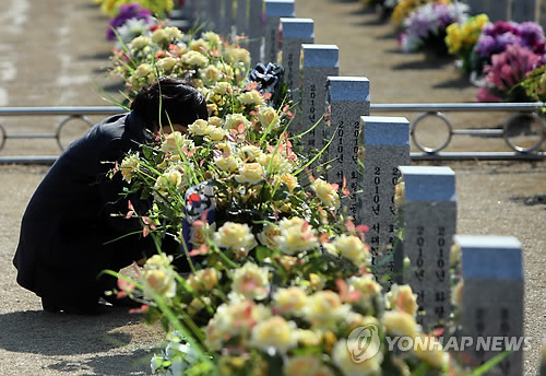 | △ 끝나지 않은 슬픔 (대전=연합뉴스) 양영석 기자 = 천안함 피격 5주기를 하루 앞둔 25일 대전 현충원 천안함 묘역을 찾은 유가족들이 희생자들을 추모하고 있다. |