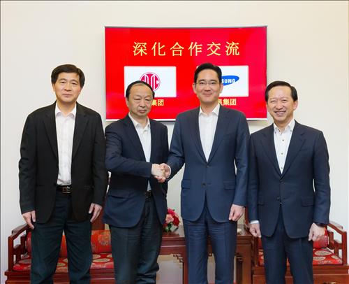 △ 삼성전자 이재용 부회장은 지난 25일 중국 베이징에서 CITIC(중신)그룹 창쩐밍 동사장(董事長)을 만나 삼성과 CITIC그룹간 금융사업 협력 확대 방안에 대해 협의했음. 사진 왼쪽부터 중신증권 청보밍 사장, CITIC그룹 창쩐밍 동사장, 이재용 부회장, 삼성증권 윤용암 사장