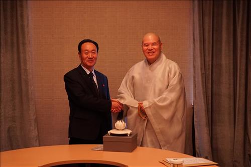 | △ 조계종 총무원장 자승 스님(오른쪽)과 북한 조선불교도련맹의 강수린 위원장<<조계종 제공>> |
