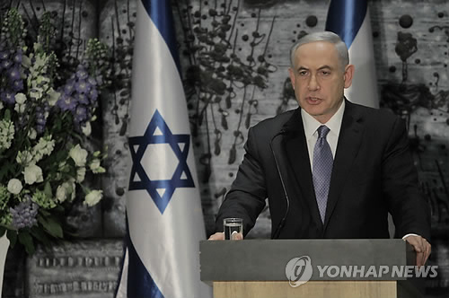 | △ (AP=연합뉴스) 베냐민 네타냐후 이스라엘 총리가 25일(현지시간) 예루살렘에서 연설하고 있다. 네타냐후 총리는 이날 레우벤 리블린 대통령으로부터 새 정부 구성 임무를 공식적으로 부여받는 자리에서 "이스라엘은 이웃 팔레스타인에 계속해서 평화의 손길을 내밀 것"이라고 밝혔다. |