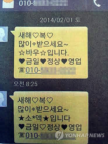 | △ 대부업체 스팸문자 (의정부=연합뉴스) 경기 의정부경찰서는 6일 스팸문자를 보내 불법 고금리 대부업을 한 혐의(개인정보 보호법 위반 및 대부업의 등록 및 금융이용자보호에 관한 법률 위반)로 30대 일당을 검거했다. 사진은 업자가 무작위로 보낸 문자메시지를 캡처한 것. 2014.3.6 <<지방 기사 참조, 의정부경찰서 제공>> suki@yna.co.kr |