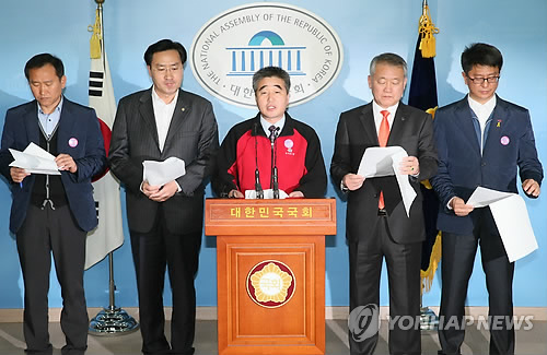 | △ 공무원단체 여야 연금개혁안 거부 (서울=연합뉴스) 진성철 기자 = 27일 국회 정론관에서 공무원연금개혁 국민대타협기구에 참여중인 공무원노조 대표자들이 여야의 공무원연금 개혁안을 모두 거부하며 소득대체율의 현행 수준(57%) 유지 등 공투본의 입장을 발표하고 있다. |