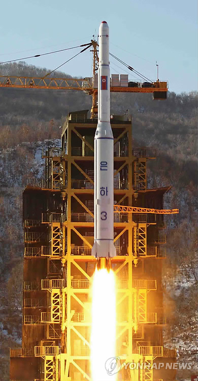 | △ 북한 핵·미사일·사이버전 실질적 위협 (서울=연합뉴스) 북한의 핵, 미사일, 사이버전(戰) 능력이 한반도는 물론 미국 본토에도 실질적 위협이 되고 있다고 미국 싱크탱크 헤리티지재단이 분석했다. 헤리티지재단은 24일(현지시간) 공개한 '2015년 미국 군사력 지수' 자료에서 북핵과 미사일, 사이버전 능력을 일일이 소개했다. 사진은 북한 조선중앙통신이 지난 2012년 12월 보도한 평안북도 철산군 동창리에서 발사되고 있는 북한 장거리 로켓 은하3호. 2015.2.25 << 연합뉴스 DB >> photo@yna.co.kr |
