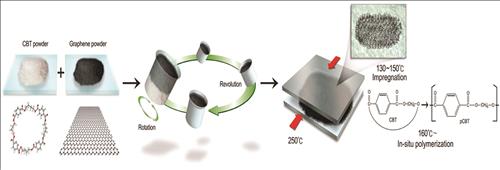 연구진은 열을 가하면 중합반응이 진행돼 고분자가 되는 고리형 소중합체의 일종인 CBT(Cyclic butylene terephthalate) 입자를 그래핀 입자와 잘 섞은 다음 열을 가해 그래핀이 균일하게 분산된 고분자 복합소재를 만드는 데 성공했다.