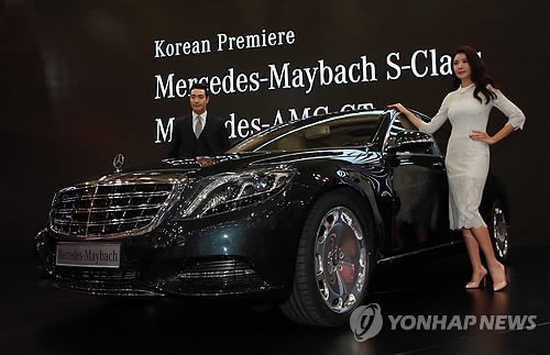 | △ 메르세데스 마이바흐 S-클래스 (고양=연합뉴스) 박동주 기자 = 2일 경기도 고양시 킨텍스에서 열린 국내 최대 자동차 축제 2015 서울모터쇼 언론 공개 행사에서 모델들이 메르세데스-벤츠의 '더 뉴 메르세데스 마이바흐 S-클래스'를 선보이고 있다. 2015.4.2 pdj6635@yna.co.kr |