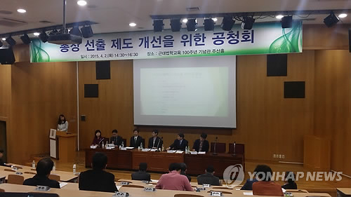 | △ 서울대 총장 선출 제도 개선을 위한 공청회 (서울=연합뉴스) 고은지 기자 = 2일 서울대 관악캠퍼스 근대법학교육 100주년 기념관에서 열린 '총장 선출 제도 개선을 위한 공청회'. '총장선출제도 평가 및 개선 연구팀'은 이날 공청회에서 총장추천위원회가 후보를 추천할 때 우선순위를 정하고 이사회에서 이를 최대한 존중하도록 권고한다는 안을 내놓았다. |
