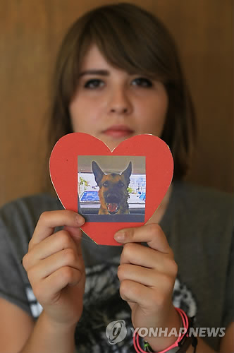 | △ 줄리에타 로블양이 자신이 키웠던 독일 셰퍼드 복스의 사진을 들고 있다. (AP=연합뉴스) |