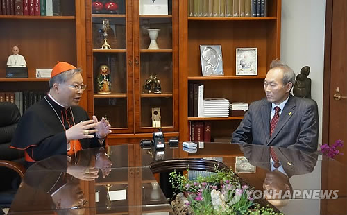 | △ 세월호참사 특조위 위원장 만난 염수정 추기경 (서울=연합뉴스) 천주교 서울대교구장 염수정 추기경(왼쪽)과 4.16 세월호참사 특별조사위 이석태 위원장이 3일 오후 서울 명동 천주교 서울대교구청 집무실에서 대화하고 있다. 2015.4.3 << 천주교 서울대교구 제공 >> photo@yna.co.kr |