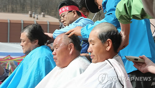 △ 포천 주민들 '사격장 안전대책 마련' 촉구 삭발 (포천=연합뉴스) 노승혁 기자 = 3일 오후 경기도 포천시 미8군 로드리게스 훈련장(영평사격장) 입구에서 영평·승진사격장 대책위 회원들과 인근 마을 주민들이 안전 대책을 요구하는 집회를 열며 삭발을 하고 있다. 지난해 11월 이후 최근까지 사격장 너머 마을인 영북면에서만 총탄과 포탄이 떨어지는 사고가 세 차례 발생했다. 2015.4.3 nsh@yna.co.kr