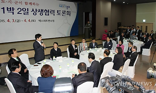 △ 경기도 지자체장 한자리에 (안산=연합뉴스) 3일 오후 경기도 안산시 대부도 엑스퍼트연수원 컨벤션홀에서 남경필 지사와 시장, 군수, 부시장 등이 함께하는 1박2일 상생협력 토론회가 열리고 있다. 토론회는 올해 연정(聯政)의 기치로 내건 '시·군과의 예산연정'을 위해 지난 1월 시장·군수 간담회에서 남 지사가 제안해 성사됐다. 2015.4.3 <<경기도 제공>> zorba@yna.co.kr