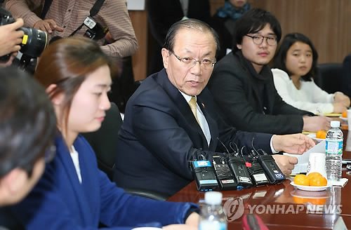 △ 황우여 사회부총리, 대학생 대표와 간담회 (서울=연합뉴스) 박지호 기자 = 황우여 사회부총리 겸 교육부 장관이 4일 오후 서울 서초구 우면동 한국교육개발원에서 대학생 대표들과 만나 대학구조개혁 등 교육현안을 놓고 의견을 교환하고 있다. 2015.2.4 jihopark@yna.co.kr