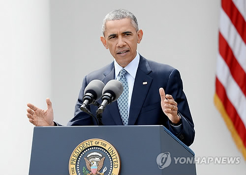 | △ (epa=연합뉴스) 오바마 대통령이 2일(현지시간) 백악관에서 이란 핵협상 타결과 관련해 특별성명을 발표하고 있다. |
