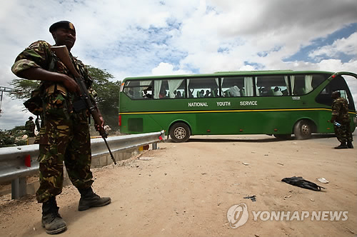 △ 이슬람 극단주의 무장세력 알샤바브의 공격에서 살아남은 가리사 대학 학생들이 4일(현지시간) 케냐군 병사가 경비하는 가운데 버스를 타고 집으로 떠나고 있다. (EPA=연합뉴스 자료사진)