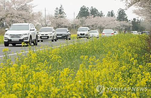 △ 벚꽃과 유채꽃이 활짝 펴 봄 정취를 물씬 풍기는 제주 서귀포시 표선면 가시리의 녹산로에서 도민과 관광객이 산책과 드라이브를 즐기고 있다.(연합뉴스 자료사진)