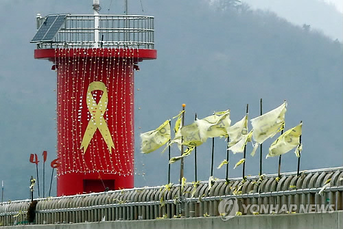 | △ <세월호 참사 1년> 쓸쓸한 팽목항 (진도=연합뉴스) 박철홍 기자 = 오는 16일이면 세월호 참사가 발생한 지 1년이 된다. 사진은 지난 3일 세월호 희생자 추모의 상징적 공간이 된 전남 진도군 팽목항에 걸린 추모 깃발들이 바닷바람에 삭아 찢기는 등 쓸쓸한 모습을 보이는 장면. 2015.4.6 pch80@yna.co.kr |