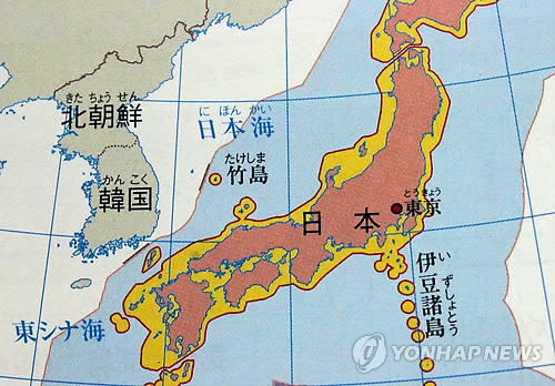 △ 독도를 일본 땅으로 표기한 일본 중학교 교과서 (도쿄=연합뉴스) 이세원 특파원 = 6일 일본 문부과학성의 검정을 통과한 중학교 교과서의 지도에 독도가 다케시마(竹島·일본이 주장하는 독도의 명칭)로 표기돼 있고 일본 땅으로 구분돼 있다. 이 교과서는 내년도부터 사용된다.