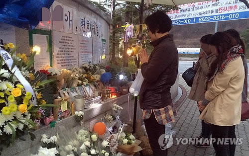 | △ 추모하는 시민 (용인=연합뉴스) 류수현 기자 = 지난달 30일 운행 중이던 어린이 통학차량에서 떨어져 숨진 양모(6)양을 추모하기 위한 분향소가 경기 용인 사고 현장 주변에 차려졌다. 6일 오후 분향소를 찾은 시민이 양양을 추모하고 있다. 2015.4.6 you@yna.co.kr |
