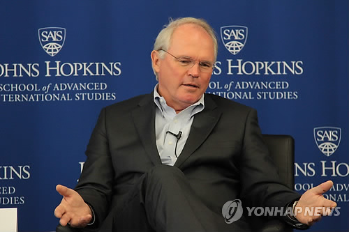 △ 힐 전 美차관보 "이란핵협상, 6자회담 자극제 될수도" (워싱턴=연합뉴스) 심인성 특파원 = 크리스토퍼 힐 전 미국 국무부 동아시아태평양 담당 차관보가 6일(현지시간) 미국 주도의 이란 핵협상이 북한 비핵화 협상에 미칠 영향에 대해 언급하고 있다.