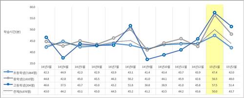 초·중·고교생 전체의 하루 평균 영어 공부시간은 44.1분으로 집계됐다.