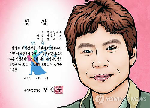 (부산=연합뉴스) 오수희 기자 = 부산지방법원이 우수 직원에게 주는 표창장에 수상자의 초상을 팝아트(pop art) 형태로 담아 화제가 되고 있다.