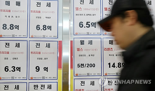 | △ 지난해 3월 서울의 평균 전셋값이 3.3㎡당 1천만원을 돌파한 이후 1년 만에 다시 100만원 가량 오른 것으로 조사됐다. 서울시내 한 부동산에 걸려있는 게시물 앞으로 한 시민이 지나가고 있다. (연합뉴스 자료사진) |