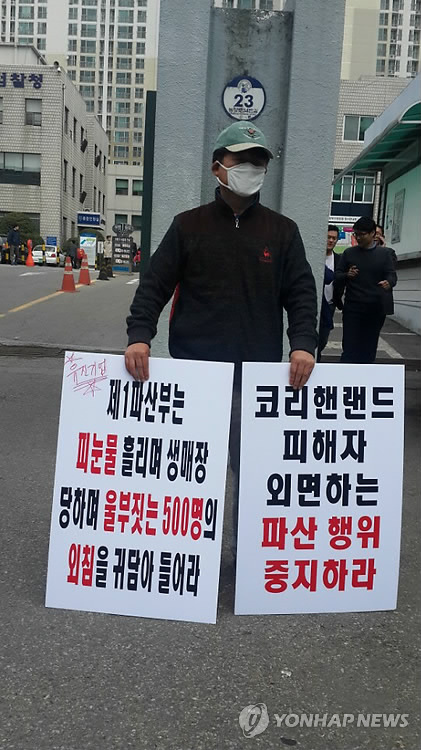 | △ "파산절차 반대" 가산노블리제CC 주주회원들 집회 (의정부=연합뉴스) 최재훈 기자 = 경기도 포천 가산노블리제 골프장의 주주회원 80여명이 8일 낮 12시께 의정부지법 인근 도로에서 파산 절차 진행 중지를 촉구하는 집회를 연 가운데 회원 중 한명이 법원 앞에서 1인 시위를 벌이고 있다.2015.4.8 jhch793@yna.co.kr |