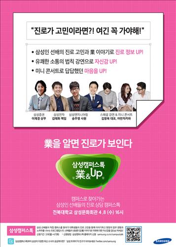 삼성그룹이 8일 전북대학교 삼성문화회관에서 '삼성캠퍼스톡 業&UP' 전북편을 열었다. 삼성캠퍼스톡은 삼성그룹 임직원들이 전국 대학생들을 찾아가 진로 고민을 함께 나누는 프로그램이다.
