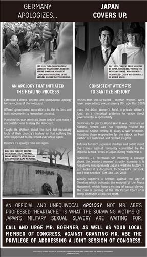 이번 광고는 지난 3월 워싱턴DC에 기반을 둔 '더 힐'(The Hill)지에 실린 광고에 이어 두 번째다. 이를 위해 가주한미포럼·시민참여센터 등 미주 한인단체들이 모금 운동을 전개하고 있다.