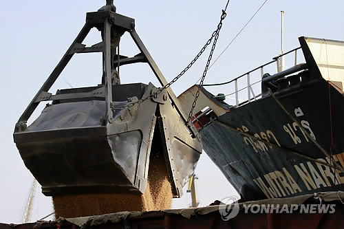 | △ 러시아 구호식량 하역작업 (AP=연합뉴스) 23일(현지시간) 북한 남포항에서 러시아로 부터 도착한 원조 식량이 크레인으로 하역되고 있다. bulls@yna.co.kr A crane loads off the Russian food aid to North Korea at Nampho port Tuesday, Dec. 23, 2014 in Nampho city, North Korea. (AP Photo/Jon Chol Jin) |
