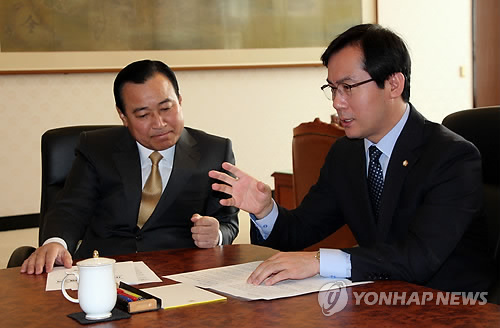 | △ 이완구-김영우 면담 (서울=연합뉴스) 9일 오전 국회에서 새누리당 김영우(오른쪽) 수석대변인이 이완구 국무총리를 만나 포천 사격장 관련 문제를 논의하고 있다. 김 의원 측은 정부 차원의 주민피해 조사 실시와 안전대책·피해보상안 마련을 촉구했다고 밝혔다. 2015.4.9 <<김영우의원실>> suki@yna.co.kr |