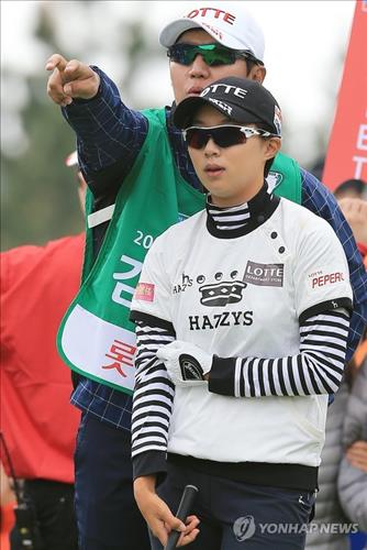 △ (제주=연합뉴스) 김호천 기자 = 지난 시즌 KLPGA 투어 상금왕인 김효주(20·롯데)가 9일 롯데스카이힐 제주컨트리클럽에서 열린 제8회 롯데마트 여자오픈 1라운드 경기 2번 홀에서 티샷을 하기 전 캐디와 이야기하고 있다. 2015.4.9