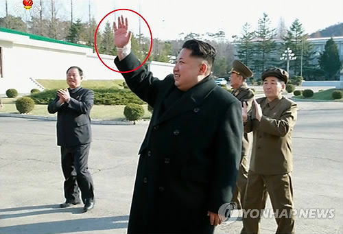 | △ 북한 김정은, 오른 손목에 부상…거즈와 반창고 붙여 (서울=연합뉴스) 평양약전기계공장을 방문해 공장 직원들을 향해 손을 흔드는 김정을 국방위원회 제1위원장의 오른손 손목 부분에 흰색거즈와 반창고가 붙어 있다. 작년 발목에 이어 또 부상을 입은 것으로 보인다. |