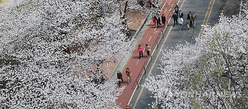 △ 벚꽃축제를 앞둔 8일 오후 벚꽃이 만개한 서울 여의도 윤중로를 시민들이 걷고 있다. 2015.4.8