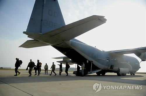 | △ 2013년 `13-2차 맥스선더(Max Thunder) 훈련'에 참가한 미 해병대원들이 C-130 항공기에서 내리고 있다.(연합뉴스 자료사진) |