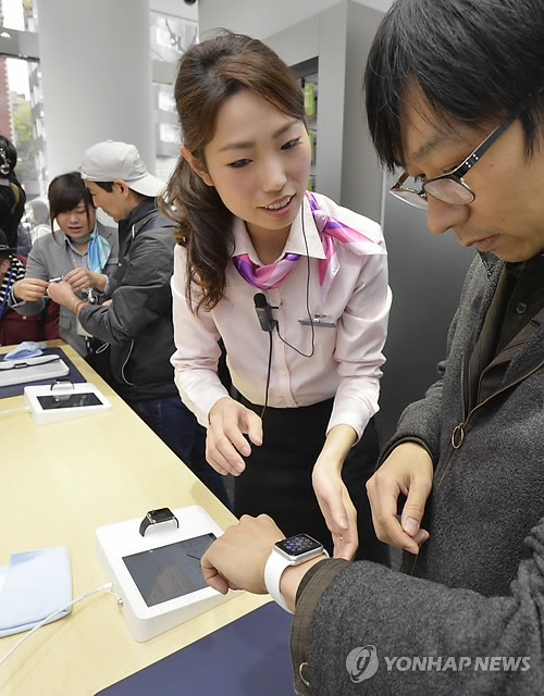 | △ 애플워치 온라인 선주문 개시 (도쿄 교도=연합뉴스) 10일 일본 도쿄 오모테산도 소프트뱅크 매장에서 한 시민이 온라인 선주문이 시작된 애플워치를 차보고 있다. 애플워치는 10일부터 미국, 영국, 호주, 캐나다, 중국, 프랑스, 독일, 홍콩, 일본 등 9개국에서 선주문이 가능하며 24일부터 매장에서 정식으로 판매될 예정이다. 한국 판매는 아직 미정이다. 2015.4.10 photo@yna.co.kr |