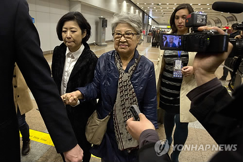 △ 산드라 서(가운데 안경쓴 이)씨가 9일(현지시간) 중국 베이징 서우두 국제공항에 도착, 지인과 손잡고 밖으로 걸어나가고 있다.